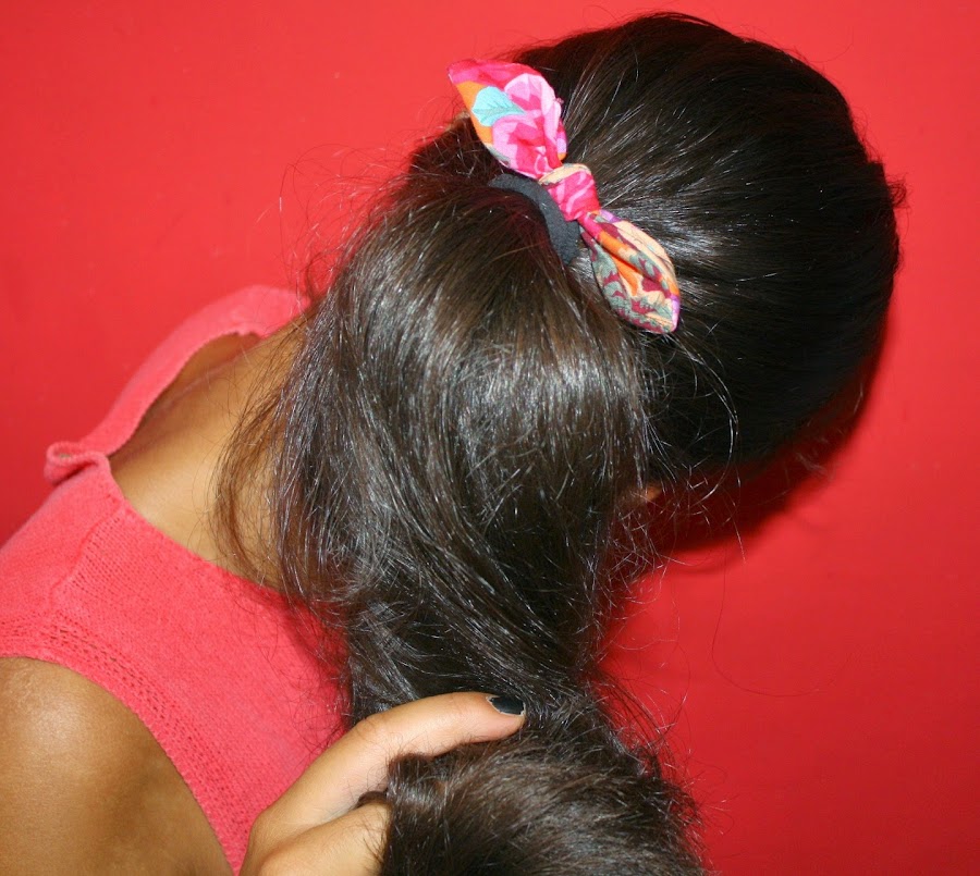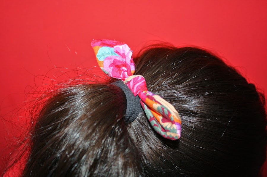 9. Para finalizar pasamos nuestro lazo por la gomilla y hacemos un nudo y nos quedaría este bonito coletero.