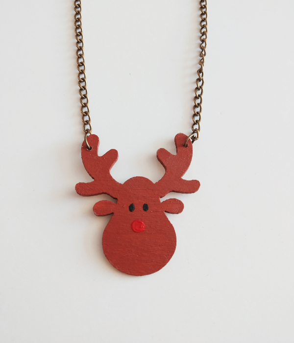 Una vez seco el barniz, pegamos las bases de los pendientes en la parte trasera de dos de los renos. Al tercero le haremos dos agujeros y le colocaremos las anillas para unirlos a la cadena.