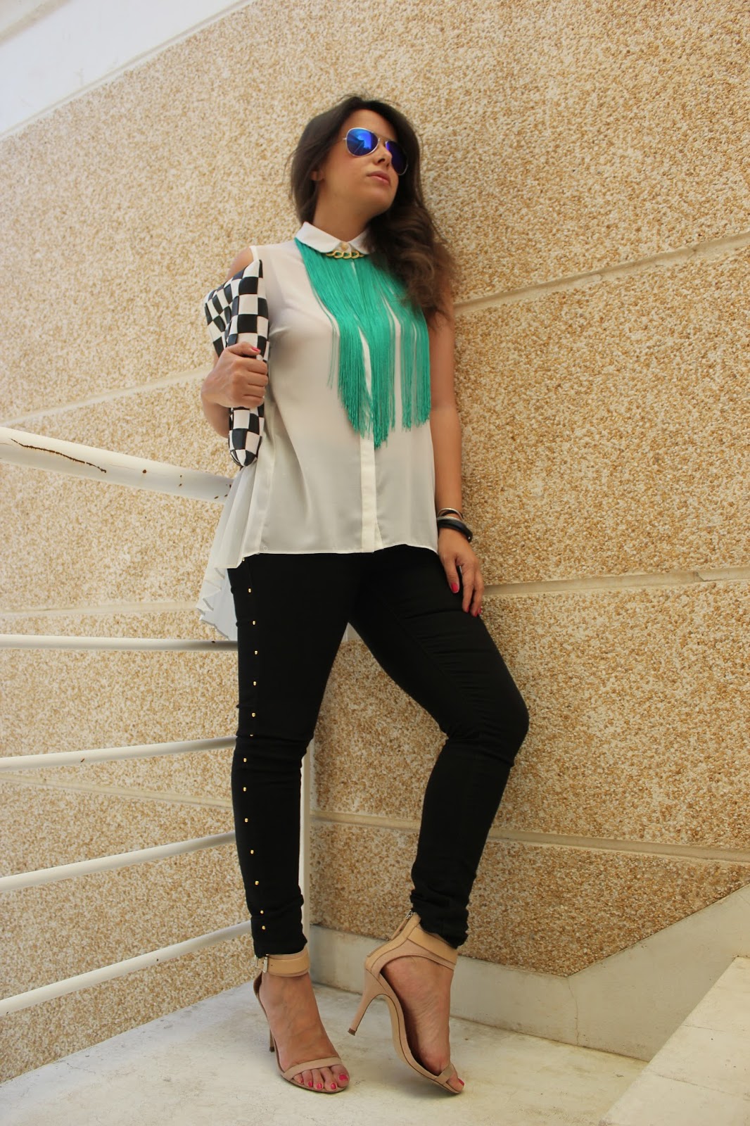 Además, aproveché también para llevar puesto mi nueva creación: EL BOLSO DE CUADROS BLANCO Y NEGRO que hice este fin de semana y que estoy absolutamente enamorada de él jijijijij Publicaré cómo hacerlo esta semana :D Así que muy atentas, porque esta semana os van a encantar los DIY"S Y CADA DÍA vais a tener uno distinto jejejeje