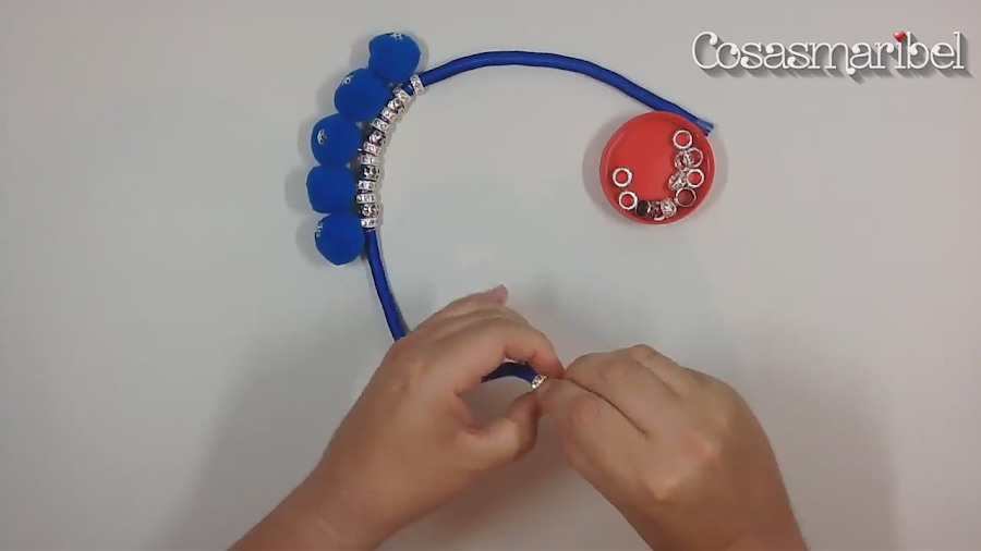 Iremos pasando separadores y pompones por el cordón tal y como indico en el vídeo.