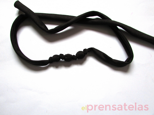 He usado una tira de punto roma que me sobró del vestido IDA. Al ser una tela gruesa y elástica he hecho la costura con la puntada recta elástica de la máquina de coser (importante para que la costura no se rompa al ir metiendo bolas y estirar la tira al hacer nudos), además he cortado bien la costura al ras para que no abultara al darle la vuelta: