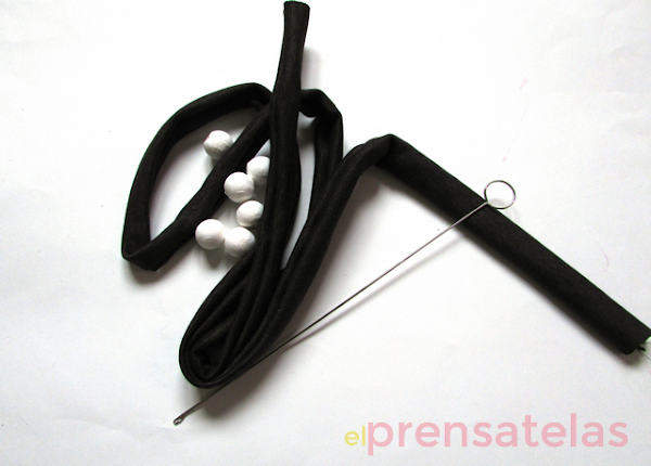Las bolas las tengo desde hace años y ni recuerdo donde las compré, pero por internet seguro.Supones lo fácil que es hacerlo ¿verdad? Coser la tira de tela, darle la vuelta y meter las bolas con nudos entre cada una de ellas, sin misterios:
