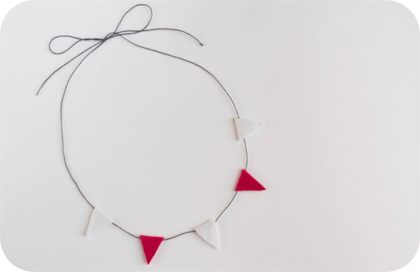 Ahora corta un trozo de cordón lo suficientemente largo para que te coja todo el cuello y de para hacer un nudo y con el pegamento textil pega los rombos de fieltro sobre si mismos con el cordón en medio ¡¡y listo!!