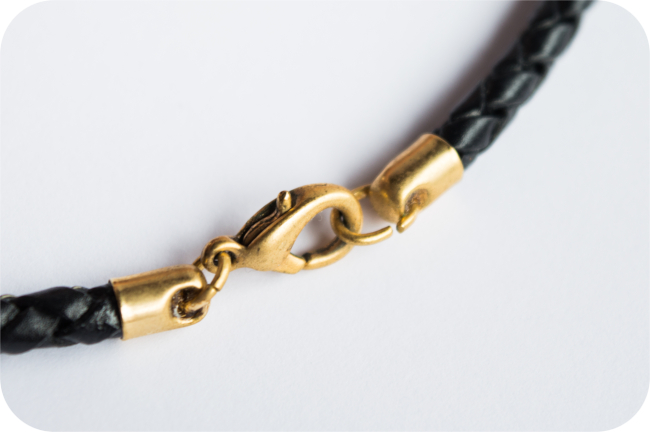 Ahora solo queda poner el mosqueton, que deberá ser del mismo diámetro que el cordón de cuero que hayamos elegido. Ponemos un poco de pegamento dentro de cada cavidad y pegamos cada uno de los extremos del cordón en cada una de los huecos de nuestro cierre y lo dejamos secar bien. A mi me gusta de un día para otro.