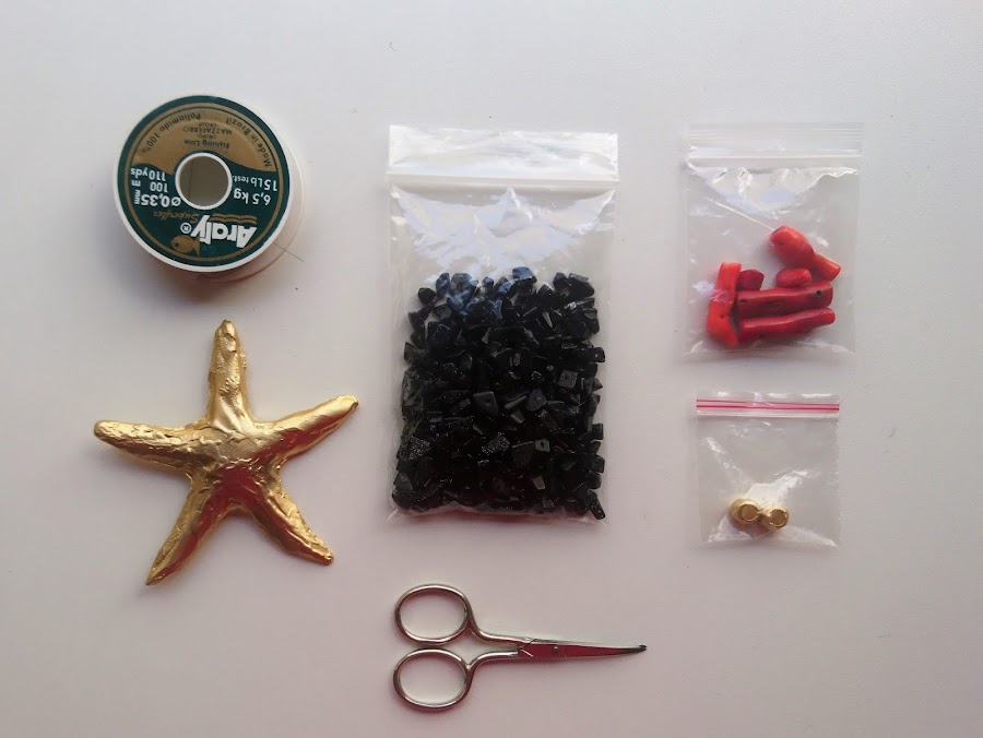 A continuación cortaremos un trozo de hilo de nylon de una longitud de un metro aproximadamente e iremos enhebrando los componentes del collar. Primero la estrella, las 2 bolas rojas, 2 abalorios de coral, las bolas doradas y por último otros 2 abalorios de coral. Una vez tengamos esto montado, empezaremos a enhebrar los abalorios negros en cada extremo, 100 a cada lado. Una vez acabado, ataremos los extremos del nylon con varios nudos, y estará terminado el collar.