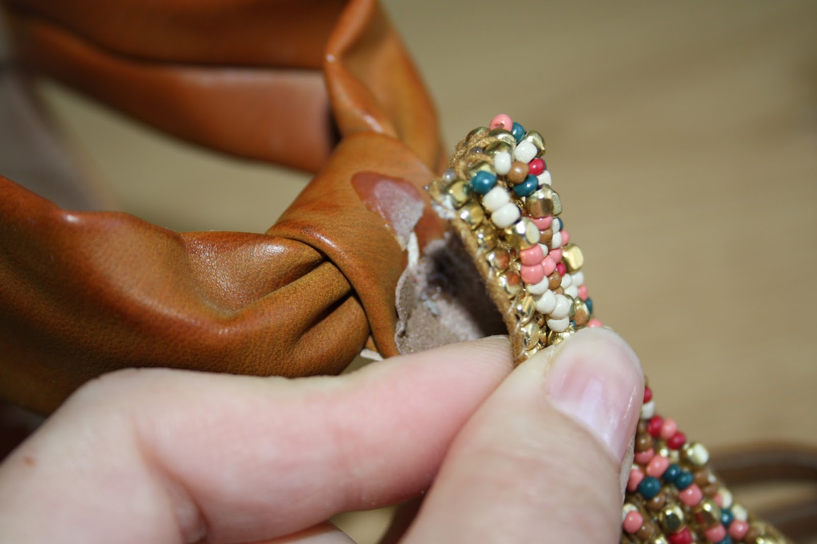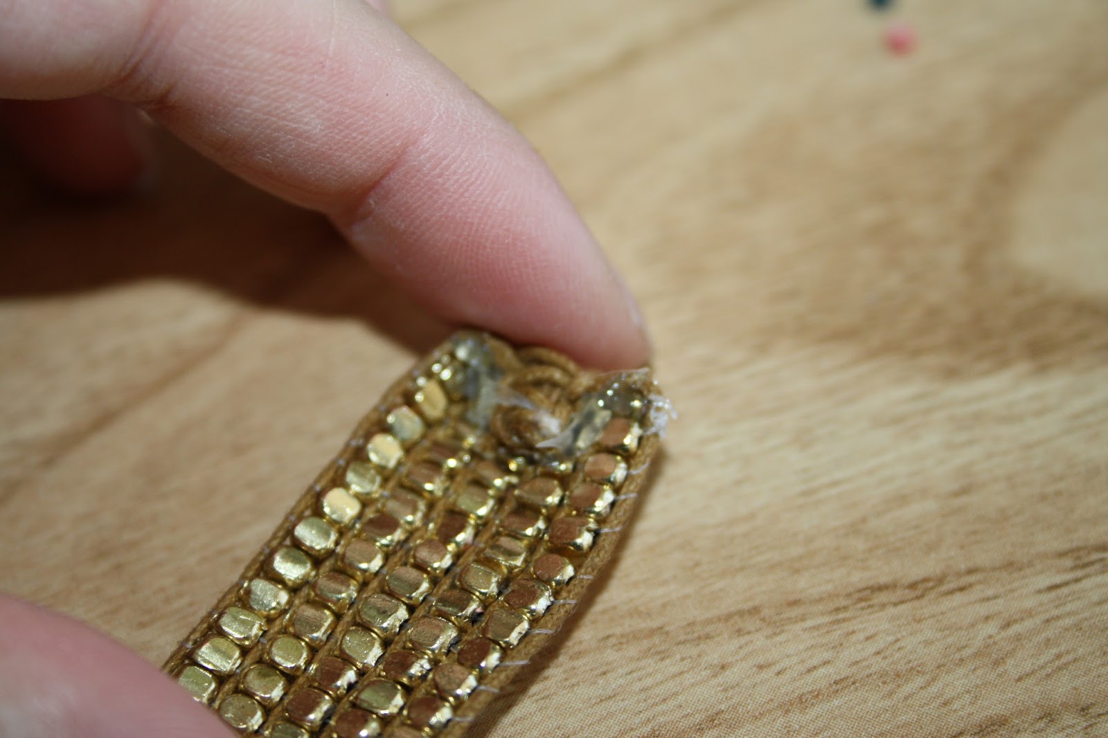 Vamos pegando con silicona desde arriba hacia abajo sin cortar la pulsera. El motivo es que si cortamos antes de situarla en la sandalia, puede ser que se nos deshilache y no queremos eso.