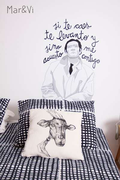 Hacía tiempo que tenía ganas de poner algo en la pared de la cabecera de la cama, en el dormitorio, pero no acababa de decidirme. Un día leí por ahí una frase de Córtazar que me pareció perfecta, así que como siempre acudí a nuestro Ilustrador preferido, Maximiliano Chimuris, y le pedí que se encargara del diseño.