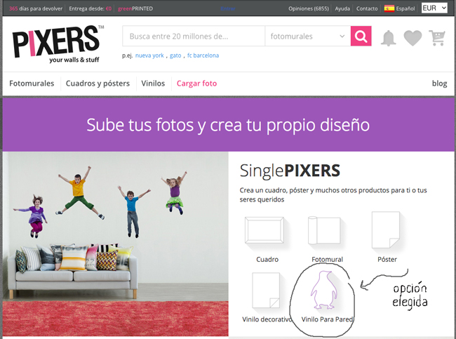 La opción que he elegido y que venía genial para mi diseño es la de cargar foto. Con nuestra foto podemos encargar diferentes productos: cuadro, fotomural, póster, vinilo decorativo o vinilo para pared, que es la opción que mejor le venía a mi diseño porque se ajusta a los bordes.