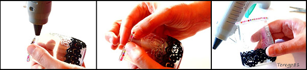 Para este otro utilicé el terciopelo negro y le coloqué una tira de cristales, que ya contienen pegamento en la parte posterior, aunque para asegurarme que no se despeguen le he puesto un punto de silicona caliente. En el vídeo veréis mejor como lo hago.