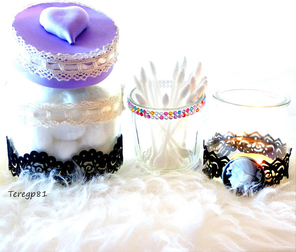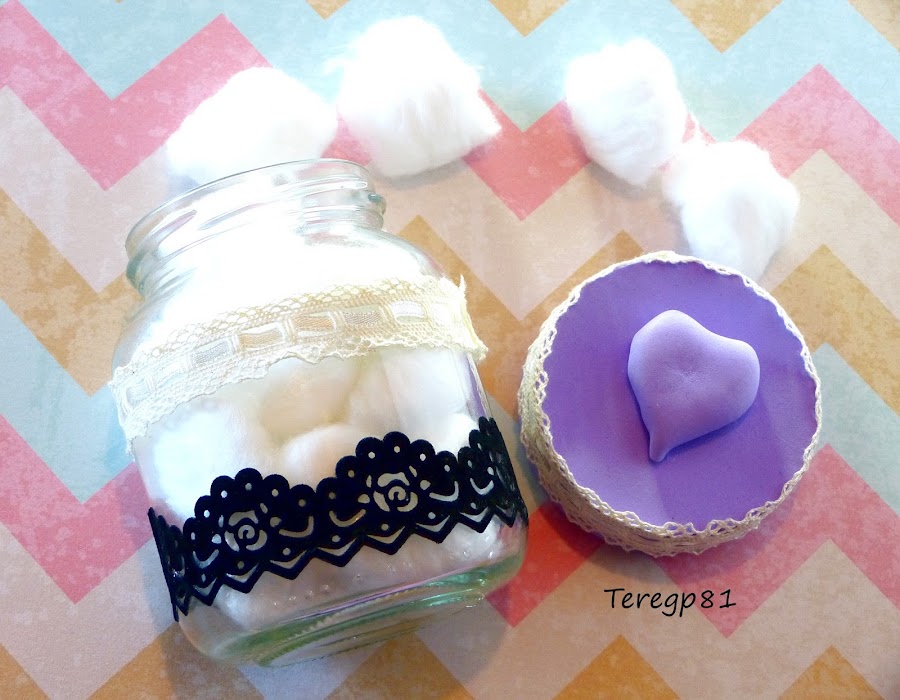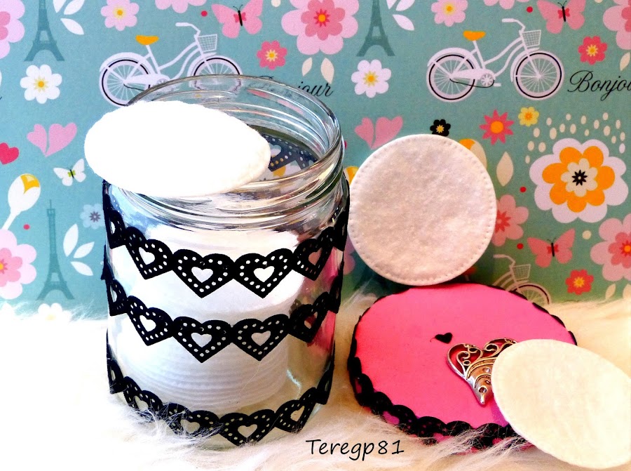 Aquí podéis ver mi bote para los discos desmaquillantes: coloqué 3 tiras de terciopelo, adorné la tapa con goma eva y alrededor de ella he puesto otra tira de corazones. El adorno de la tapa es un colgante al que le he cortado el gancho y pegué con silicona, lo he pedido en esta tienda de accesorios al por mayor.