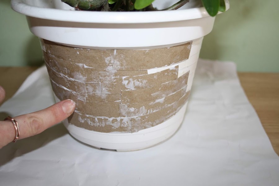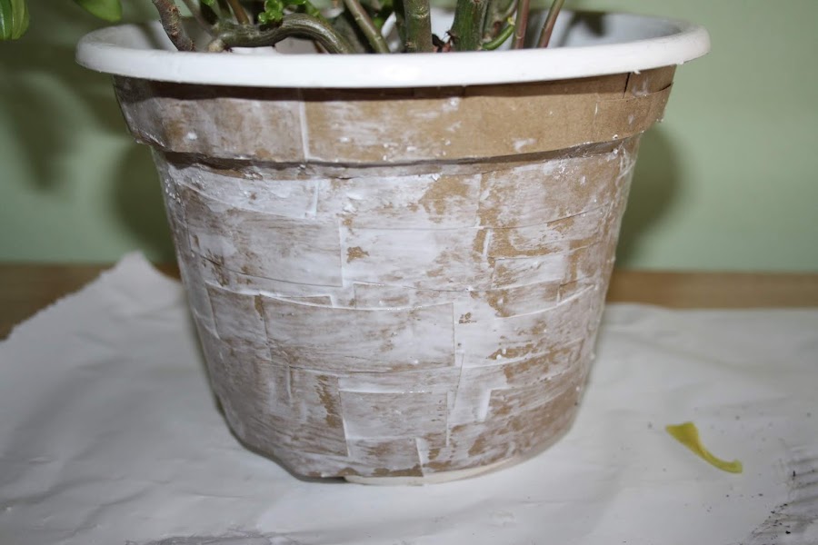 Empezamos por cortar los trozos de papel en partes pequeñas y las pegaremos una por una a la maceta. Hay que dejar secar y cuando ya esté seca será la hora de pintar. Lo ideal sería esperar un día.
