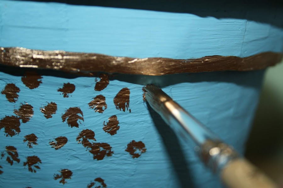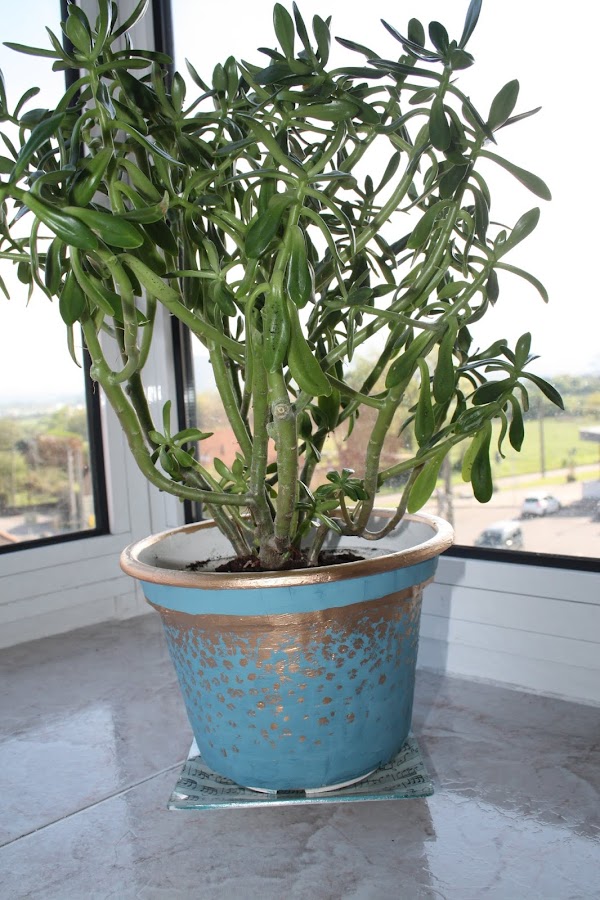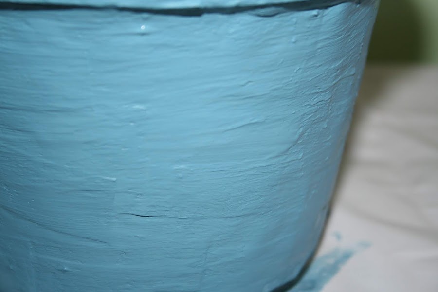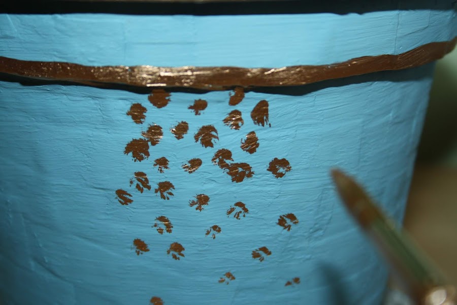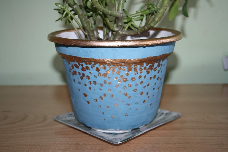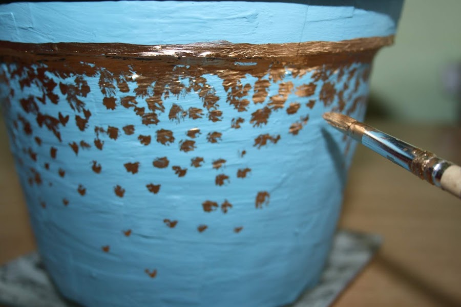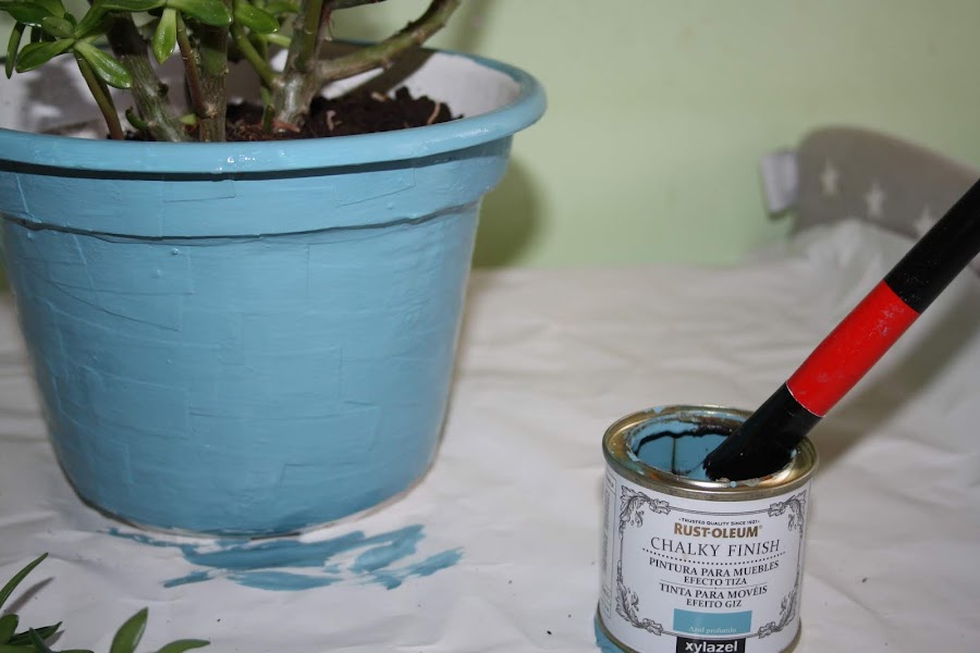 Pintaremos con pintura de tiza, daremos dos capas para que no se note tanto el efecto del papel y después pintaremos con color dorado (tanto en el borde como por toda la maceta)