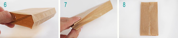 Paso 12, 13 y 14. Pegamos las solapas que se han formado con pegamento o cinta de doble cara y ya tenemos nuestra bolsa!! Para cerrarla realiza un pliegue en la parte superior.