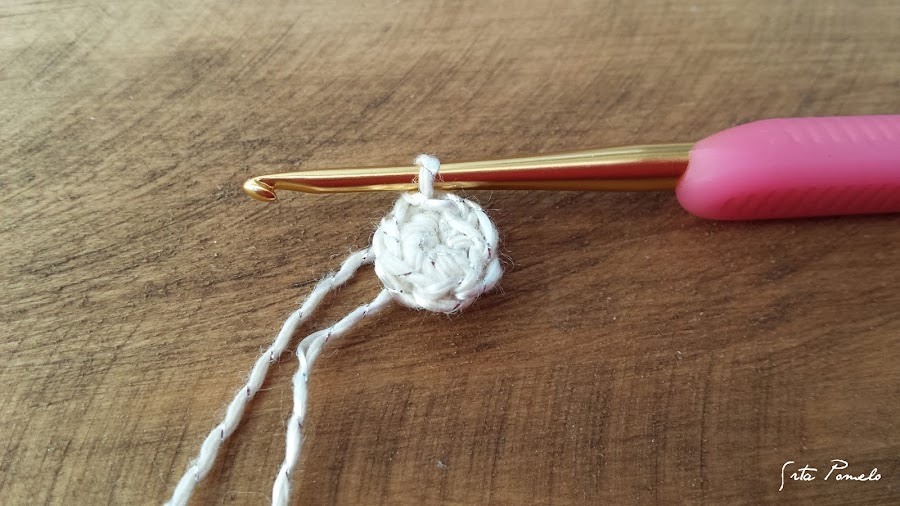 Comenzamos con una cadeneta de 6 puntos y unimos el último con el primero con un punto deslizado. A continuación hacemos 6 puntos bajos dentro de la cadeneta cerrada. Si sabéis hacer anillo mágico como el que se usa en amigurumi, podéis hacer un anillo mágico con 6 puntos bajos y luego unir el último con el primero con punto deslizado.