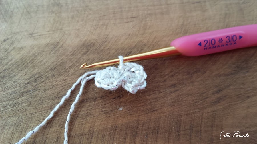 Después hacemos 3 cadenetas, 2 varetas y 3 cadenetas más dentro del mismo punto bajo.