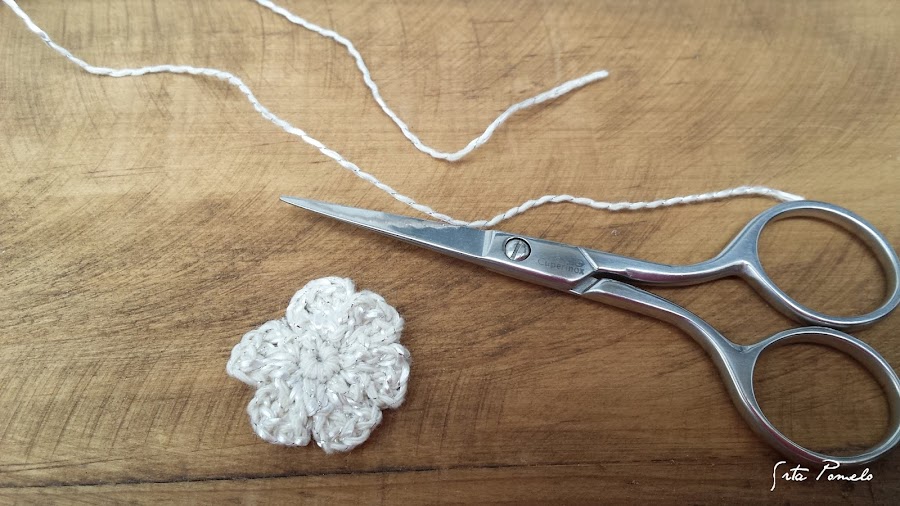 Acabamos haciendo un par de nudos a los dos cabos que nos sobran por la parte de atrás de la flor. Cortamos los sobrante, pero no muy al ras, para que no escapen los nudos.