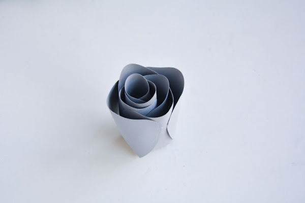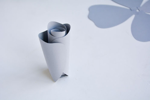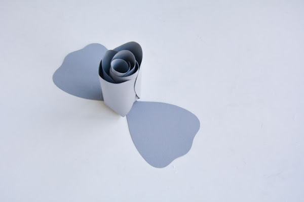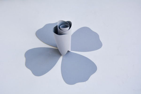 Cogemos una de las parejas de dos pétalos y pegamos los extremos entre ellos como haciendo un cilindro y lo doblamos hacia arriba, dejando la parte recta como base. Como ya les hemos dado un poco de forma redonda con el rotulador, ahora es muy fácil pegarlos juntos, sólo hay que empujarlos un poquito sobre sí mismos.