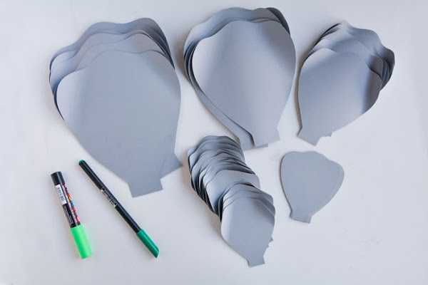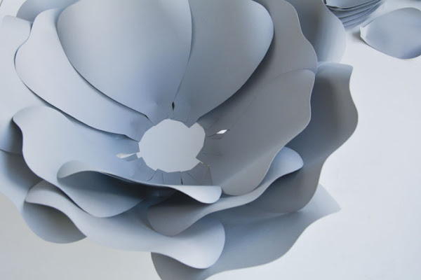 Por si os sirve de referencia yo he usado 4 cartulinas grandes, de las de 50x65cm que venden en cualquier papelería, para cada una de las flores más grandes, 3 cartulinas para la flor mediana y una cartulina para la flor más pequeñita. Eso sí, hay que hacer un poco de tetris para aprovechar bien el papel xD.