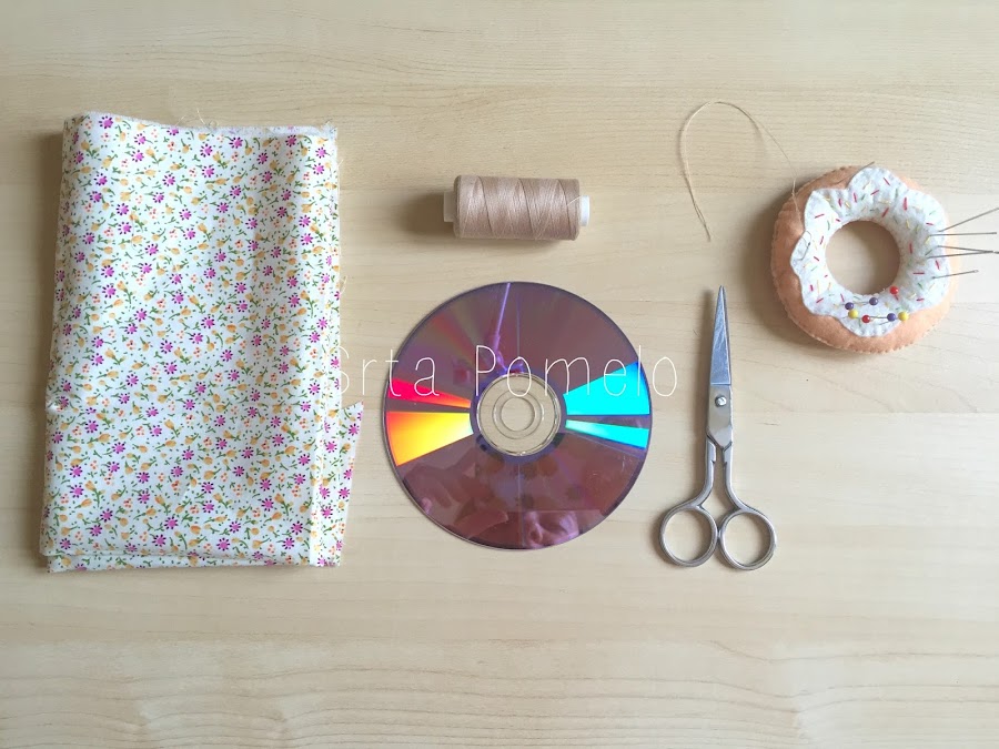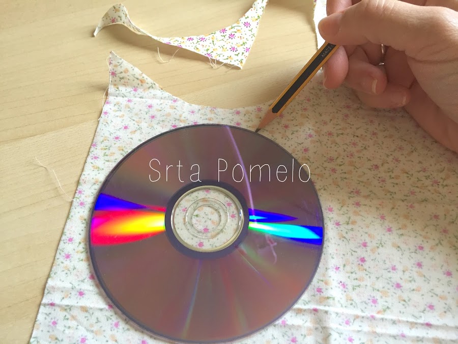 Comenzamos marcando con lápiz sobre la tela de revés un círculo. Debemos tener en cuenta que el diámetro final de nuestra flor será la mitad del círculo que marquemos al principio. Cuanto más grande es nuestro círculo marcado, más grande será la flor yoyó.