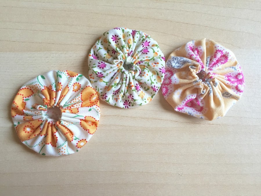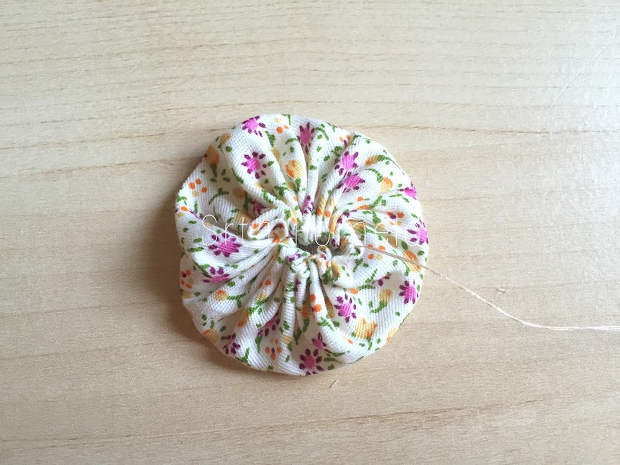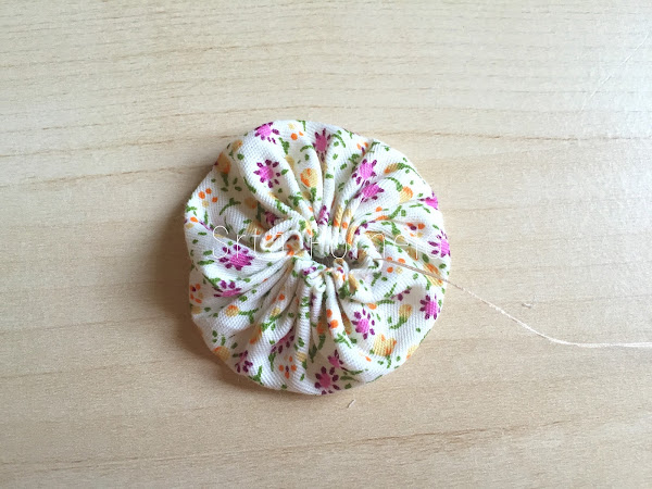 Acomodamos la tela dándole forma redonda y hacemos un par de puntadas para rematar el hilo. Cortamos el hilo y listo, ya tenemos nuestra flor yoyó acabada.