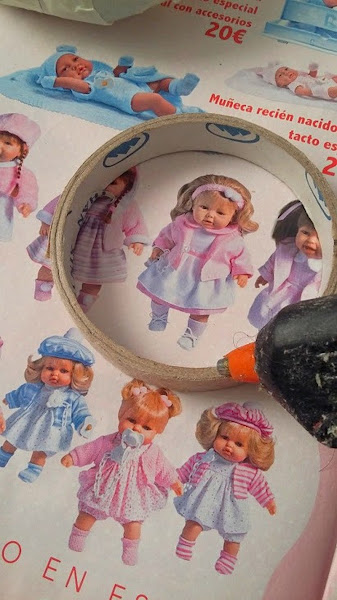 Con el rollo fino de la cinta de carrocero haremos la base. y la pegaremos con silicona caliente.