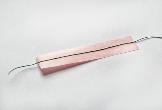 Ponemos el hilo en el medio de 2 trozos de washi tape, redondeamos los bordes, y en los laterales empezamos a cortar poco a poco para que se parezca a una pluma.