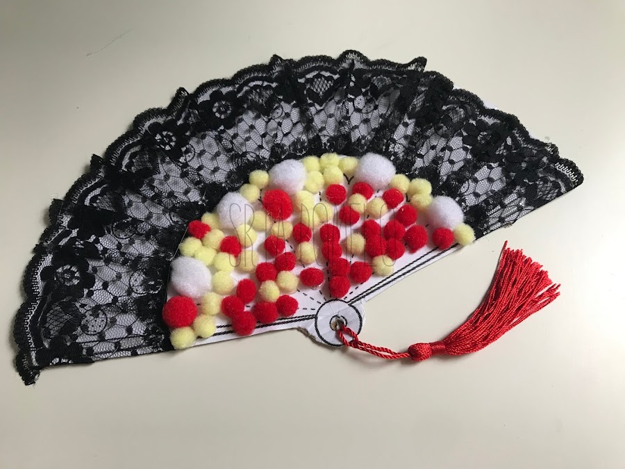 Puse la pistola de silicona a calentar y empecé a pegar el encaje negro en la parte superior, con cuidado de ir haciendo los pliegues y los pompones de menos tamaño en la parte intermedia del abanico.