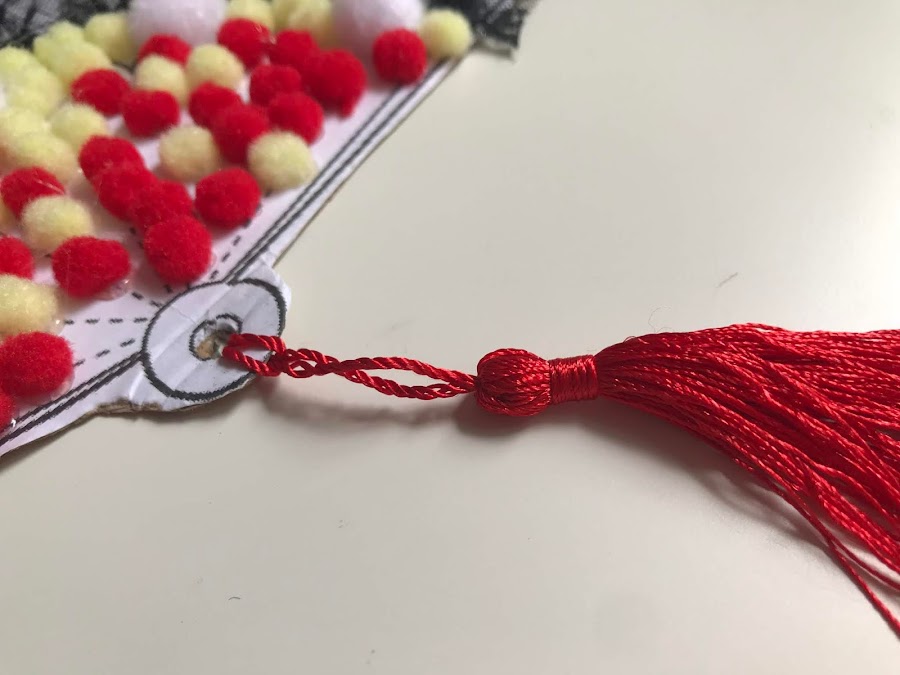 Coloqué la borla en el agujero con un nudo alondra y fui pegando algunas lentajuelas negras entre los pompones y rojas encima del encaje negro.