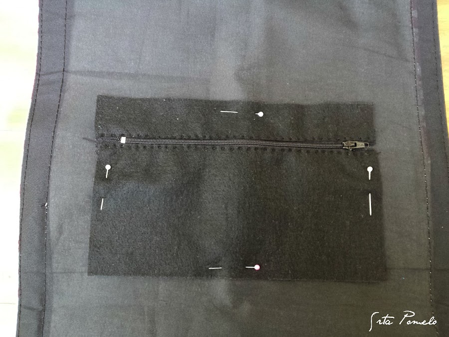 Después unimos con alfileres las piezas que acabamos de coser con el interior de lo que será nuestro bolso de mano y cosemos con hilo negro todo el contorno.