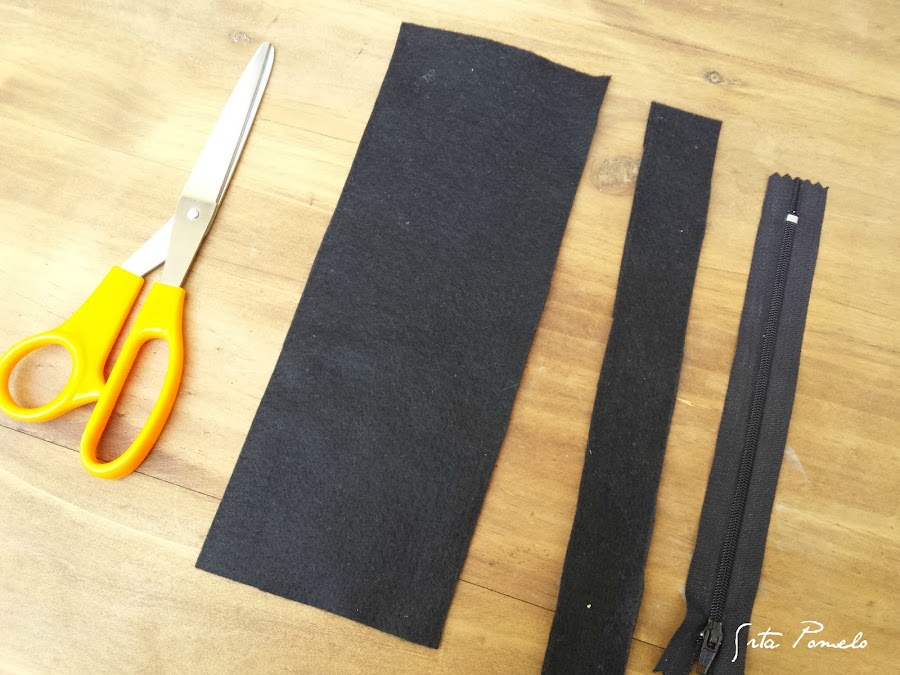 Cortamos dos rectángulos de fieltro negro, uno más fino que el otro y con la misma longitud que la cremallera. Hay que tener en cuenta que la cremallera debe ser más pequeña que el ancho del salvamanteles. Cosemos ambos trozos de fieltro, uno a cada lado de la cremallera.