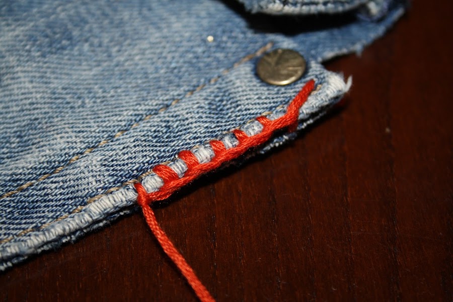 A continuación cosemos con puntada de festón todo el borde del bolso. Se puede coser del mismo color o bien combinar varios como he hecho yo.