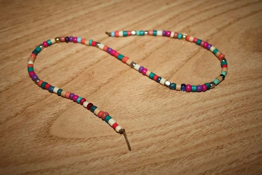 Posteriormente, haremos un cordón entero de abalorios de colores al cual le haremos un par de nudos al principio y al final para que no se suelten.