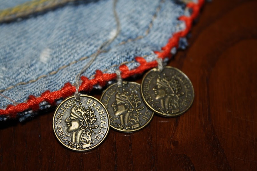 Después cosemos monedas por todo el bajo del bolso. Medid antes para que os queden más o menos todas a la misma distancia.