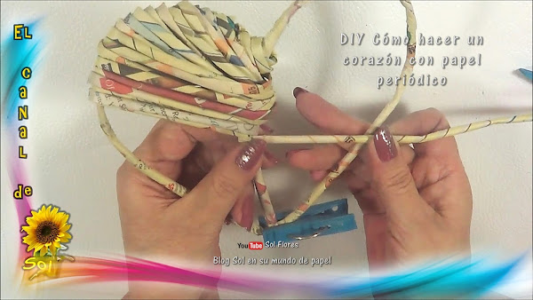 Hasta llegar a la punta inferior del corazón, aquí ponemos pegamento para que no se mueva la varilla y la traemos por enfrente, sostenemos con un broche si es necesario y ahora vamos a llevar las varillas de arriba hacia abajo, en la dirección de las manecillas del reloj, poniendo pegamento para que se mantenga en su lugar, solo es enrollar y enrollar