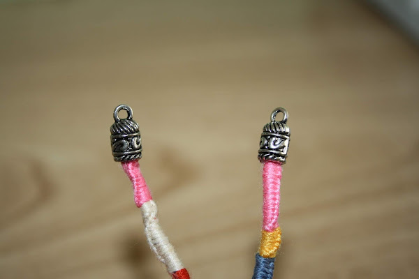 He hecho una especie de nudos con las gomas y me he ayudado de un abalorio (os enseño fotos). Después corté los sobrantes y pegué los nudos.