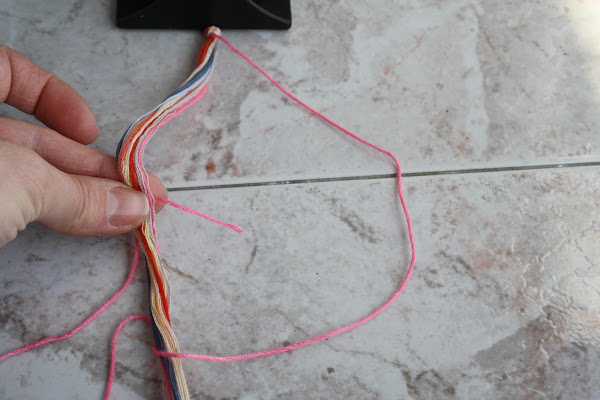 Empezamos por escoger los colores que vamos a usar y cortamos más de metro y medio de largo. Haremos un nudo con todos los cordones y los sujetaremos bajo algo bastante pesado para poder manejar el resto de los hilos. Al principio será más laborioso de trabajar pero después ya os resultará más fácil.