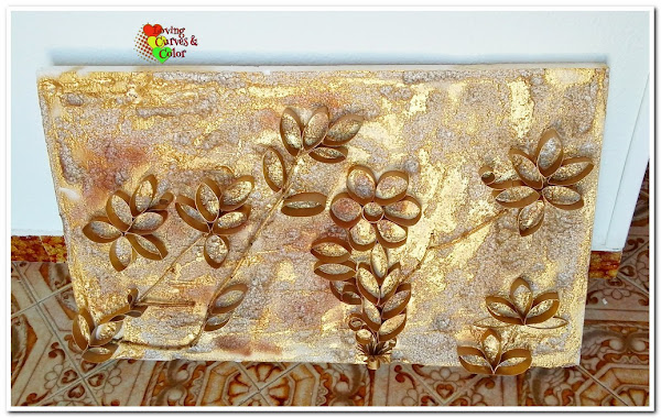 Terminado el cuadro decidí usar una pintura spray metálica que al tener solventes, derrite o funde el porexpan, de esta manera le di una textura diferente y terminar con el spray de tinte para el pelo marrón y darle un toque ahumado.