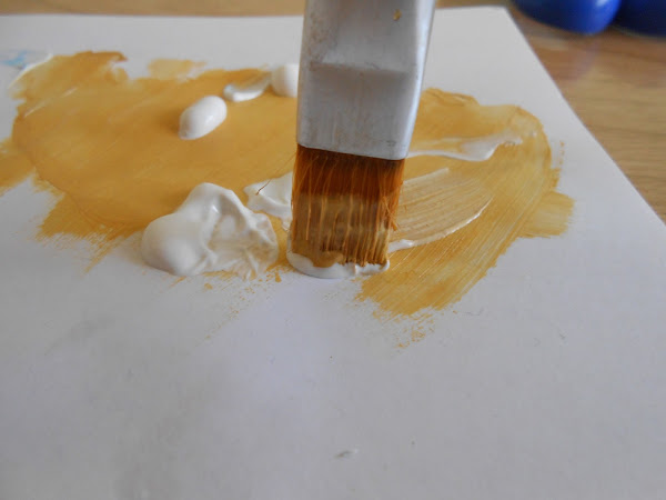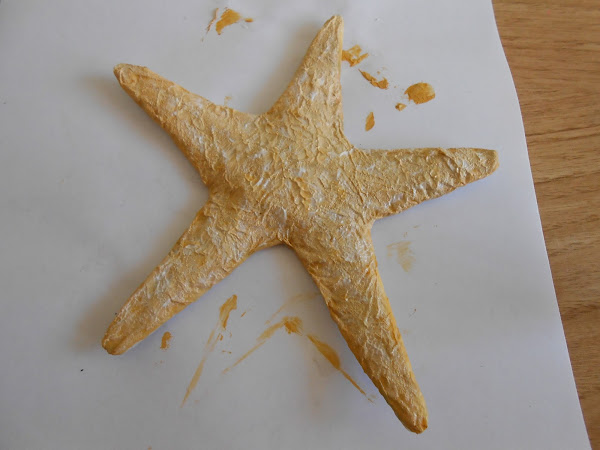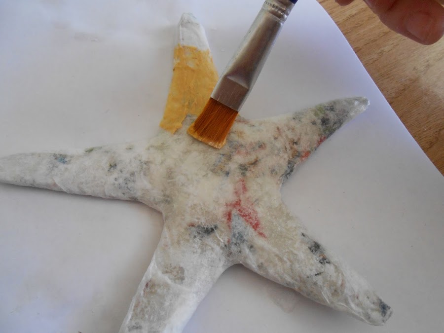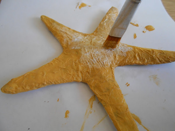 Una vez aplicada la primera capa de color siena o tostado, y con el color blanco, cogemos el pincel y colocándolo en forma vertical, pintamos con pequeños golpecitos encima del color anterior. Con esto, lo que queremos conseguir el efecto de piedra de la estrella de mar.