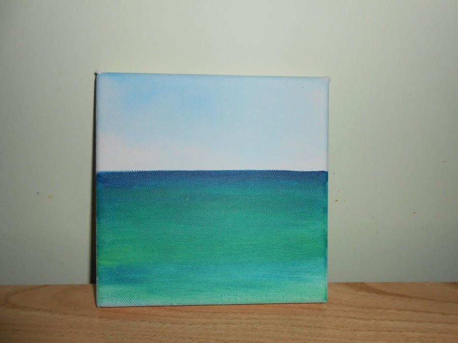 Empezamos pintando el cuadro. No es necesario saber pintar. Sólo tenéis que esbozar un horizonte. Dividí el cuadro en dos partes, simulando un océano. La parte de arriba más clarita y la de abajo más parecida al océano, difuminándolo para darle mayor realismo.