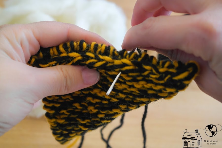 Cosemos los lados que quedan abiertos con lana del mismo color, pero dejando una pequeña abertura para rellenarlo.