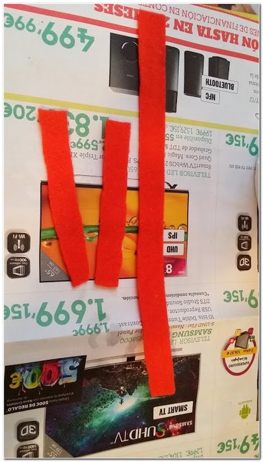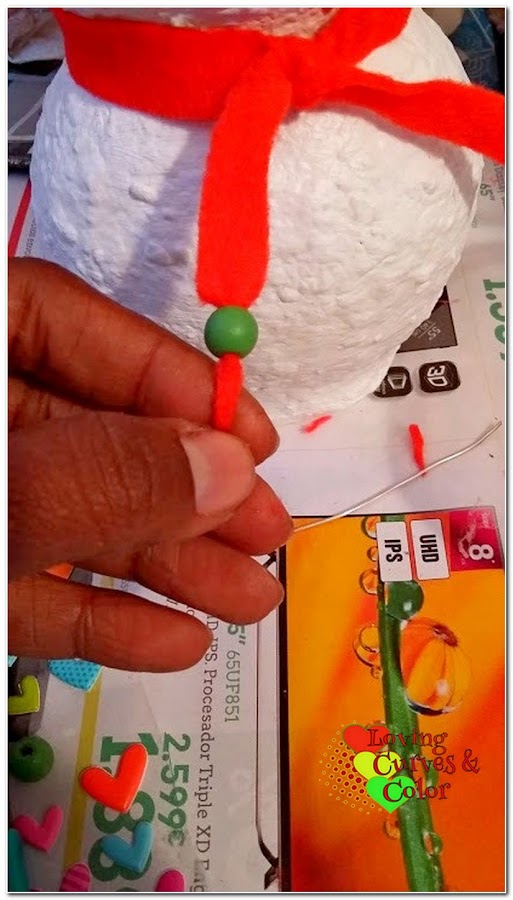 Pasando a los adornos, lo que utilicé fue fieltro en color rojo y para contrastar le puse en color verde unas bolitas de madera y un corazoncito adhesivo que lo colocaría en el sombrero.