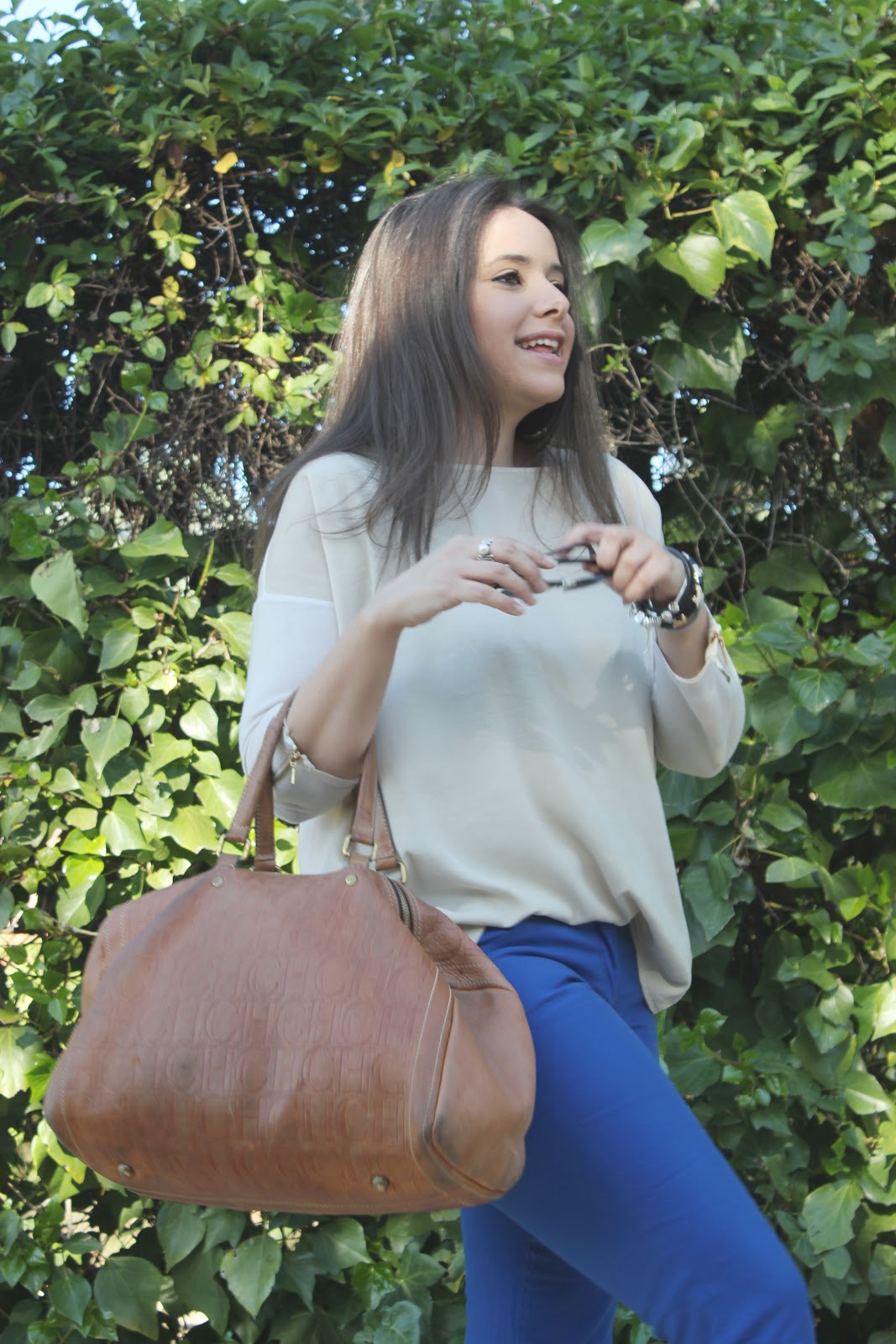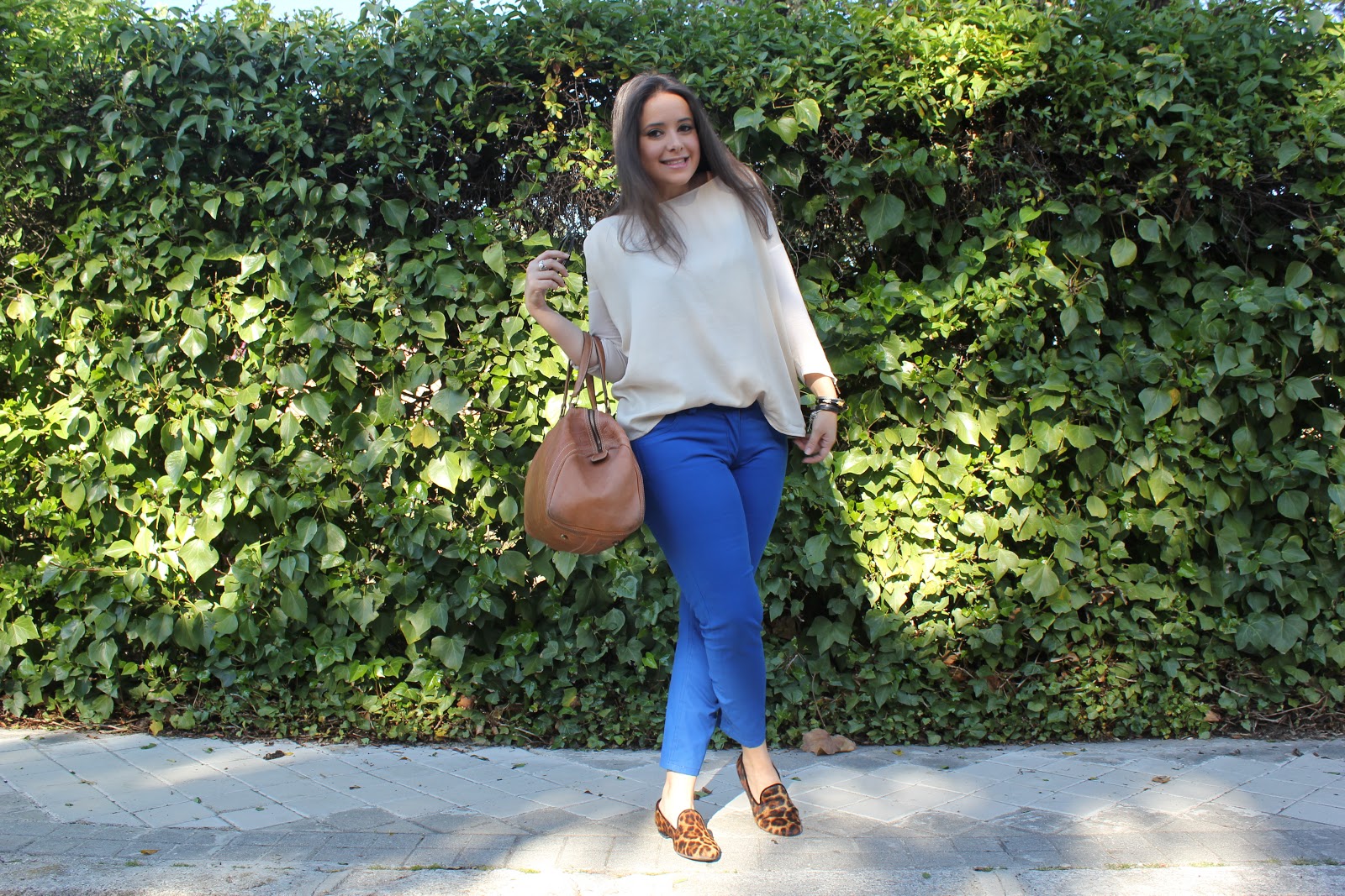 Hola, feliz viernes a todas!!! Hace poco que os mostré el pantalón azul klein que hicimos. La verdad que me pongo muchísimo este pantalón, y el día que hicimos las fotos para publicar el post, el tiempo no nos acompañaba. Aprovechando que me lo he puesto este fin de semana para ir a comer fuera, hemos sacado unas fotos y aquí os dejo el resultado. Otra forma de combinar este color con colores similares al post anterior: blanco, negro y marrón claro. En esta ocasión, los zapatos, unas slipers animal print, adquieren mucho protagonismo.