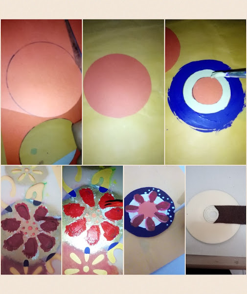 Por otro lado, he cortado un circulo de cartón en el cual pinte una flor auxiliándome de una plantilla, alrededor de la flor hice también puntos blancos para decorar.