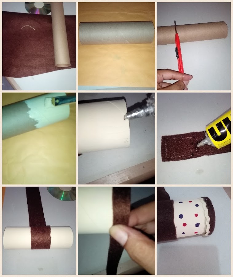 También cubrí los extremos del tubo con el fieltro. Con el revés de un pincel hice puntos de colores para decorar el tubo