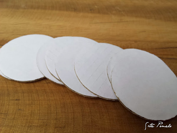 Empezamos untando los discos de cartón con pegamento en barra (se puede usar también cola blanca)