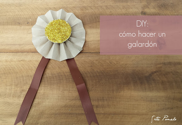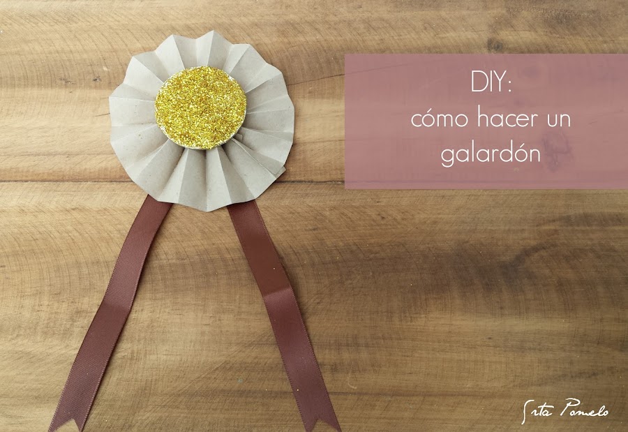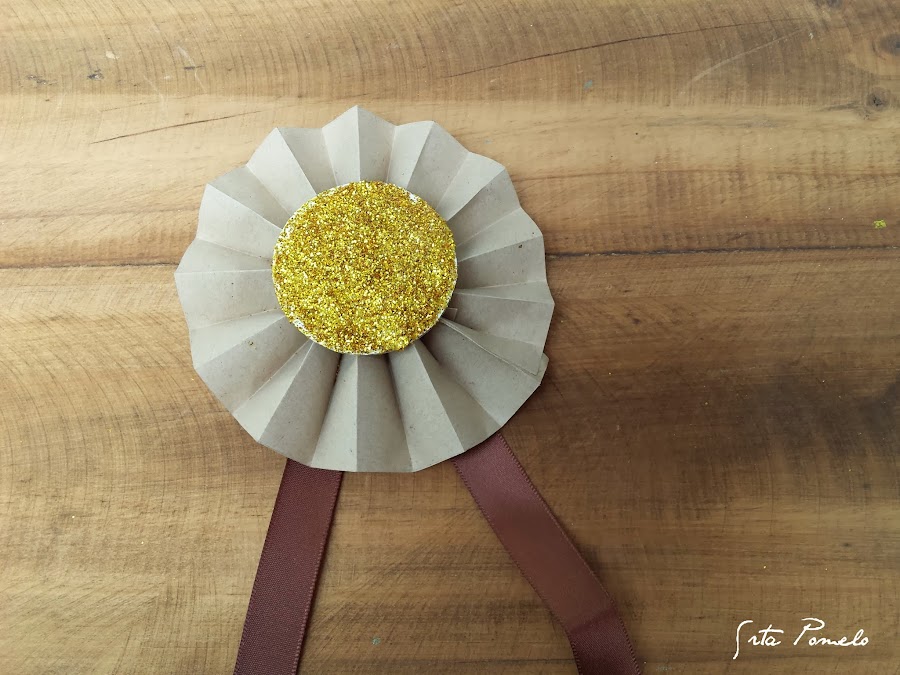 Por detrás, pegamos otro círculo de cartón SIN brillantina y a éste le pegamos un lazo de raso, del color que más nos guste. Dejamos secar todo muy bien y podemos añadirle, por último, un broche o gancho para colgarlo de la solapa del ganador.