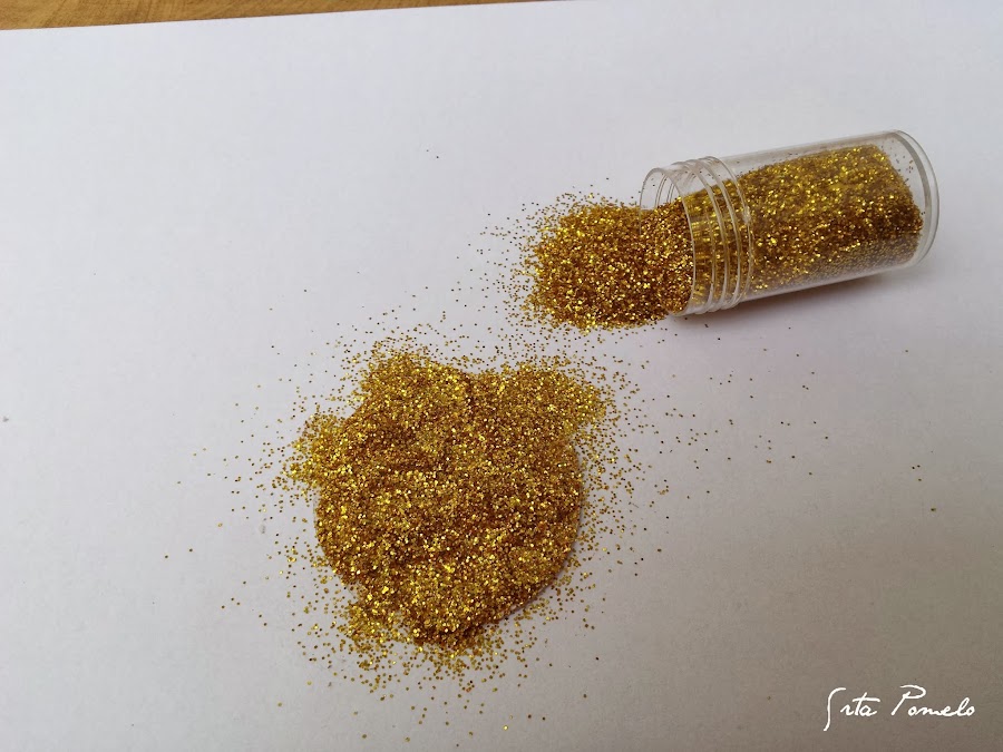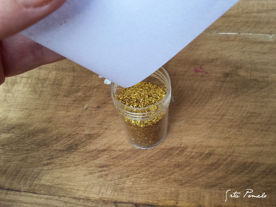 Después espolvoreamos brillantina por encima del disco y sacudimos el sobrante. Debajo he puesto un folio blanco para recuperar la brillantina que ha sobrado (aquí no se tira nada).