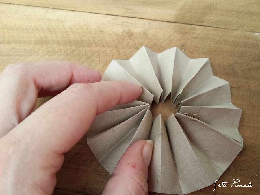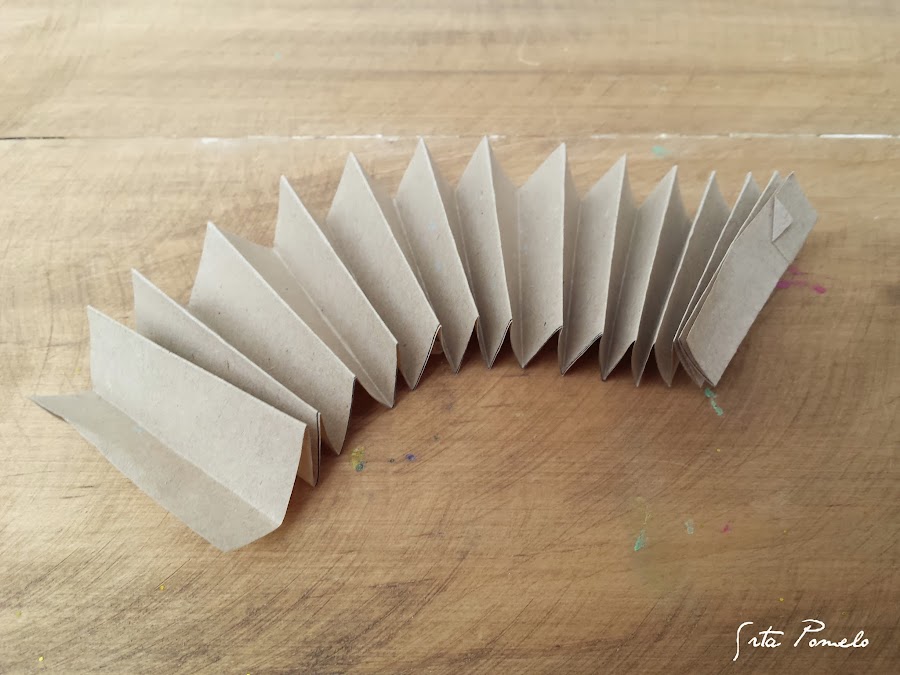 De una bolsa de papel, he recortado un rectángulo de 7 cm de ancho por 50 de largo y lo he doblado en forma de acordeón, haciendo pliegues de 1 cm más o menos (los pliegues los he hecho a ojo).