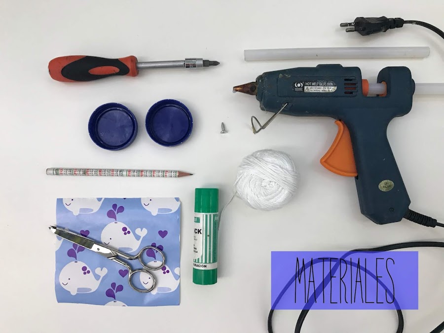 Cogemos el extremo de un ovillo de cordón de algodón y lo pasamos entre los dos tapones. Hacemos un nudo fuerte. Después cortamos unos 50-60 cm del cordón y realizamos un nudo corredizo en ese extremo.