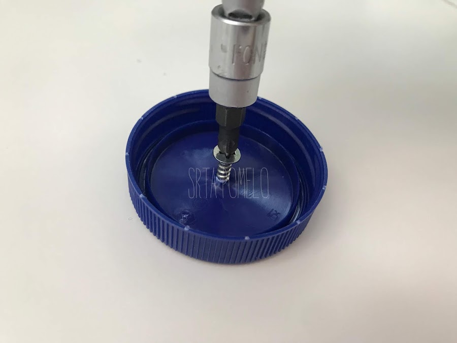 Primero hacemos un agujero en el interior del tapón, justo en el centro, y atornillamos el tornillo de tal forma que sobresalga por el otro lado. Cuidado con la superficie de trabajo, podemos dañarla. Lo mejor es trabajar sobre un cartón o un tablón de madera que no nos sirva.